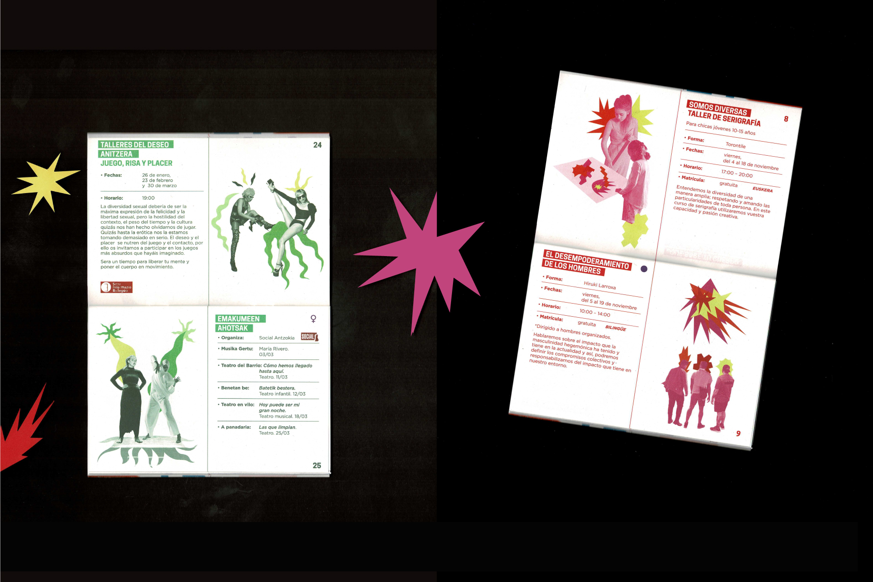 En la Berripapera del curso 22-23 realizamos tanto las ilustraciones interiores que acompañaban a las actividades como el diseño y la maquetación de la publicación. Empleamos, para ello, diferentes colores de fondo para estructurar las secciones de la agenda. Las composiciones se generan a partir de interacciones con las imágenes fotográficas. Tanto las formas como los colores están pensados para estructurar los diferentes bloques.