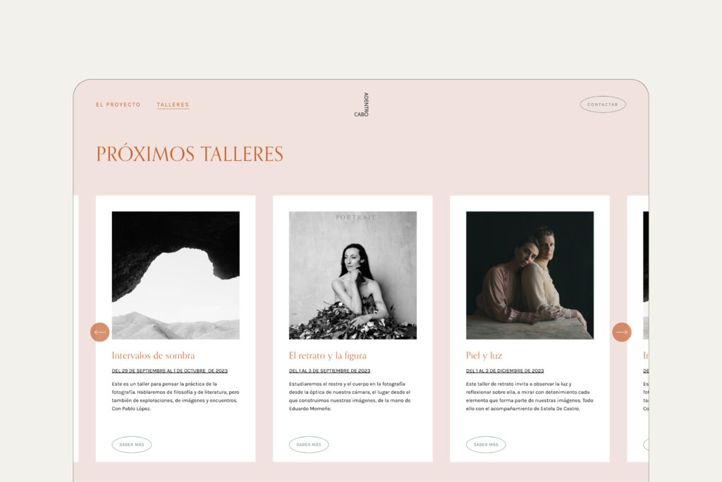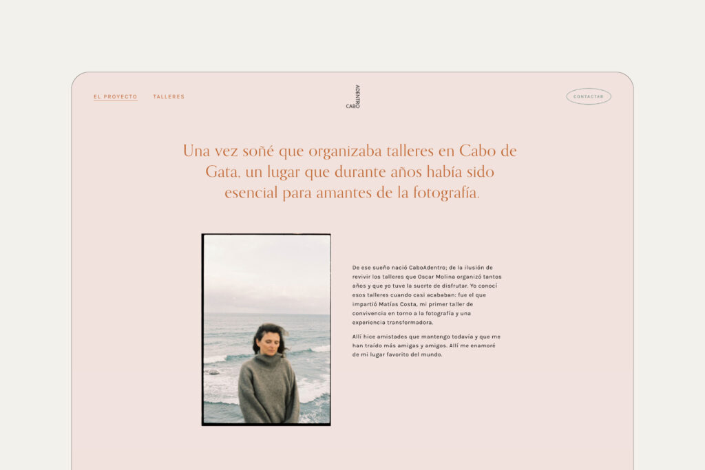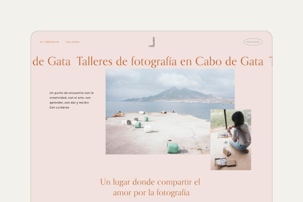 La marca que diseñé para CaboAdentro parte del concepto de Confluir, arropado por el cariño y la delicadeza de Esther, la anfitriona que hace que todo eso sea posible. La web traduce esta idea de marca donde prima la sencillez en todo momento. Una web sin artilugios, directa, amable y cercana. Donde los colores del Cabo de Gata están siempre presentes y la fotografía habita un espacio limpio y cuidado para contar historias e invita a participar de ellas.