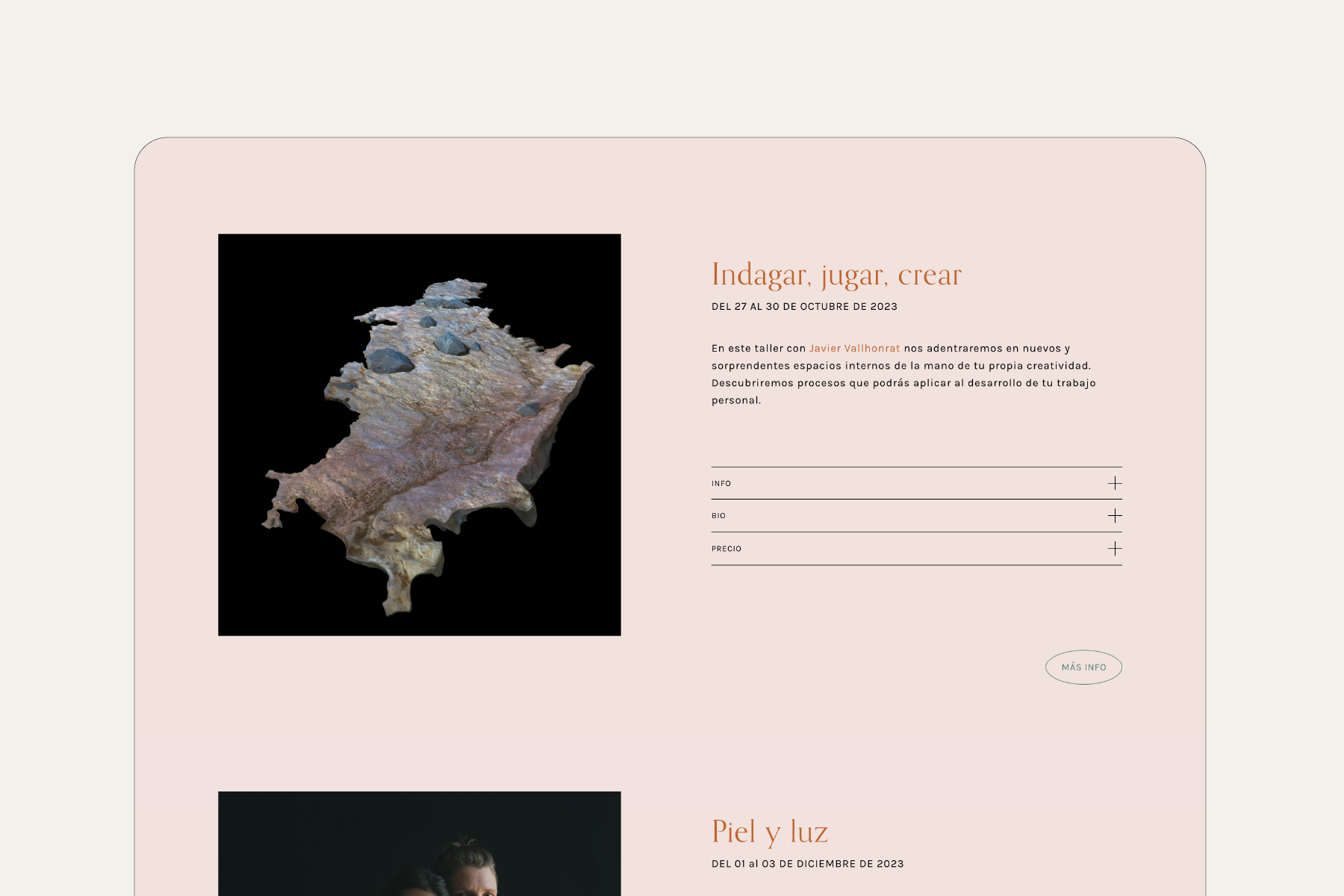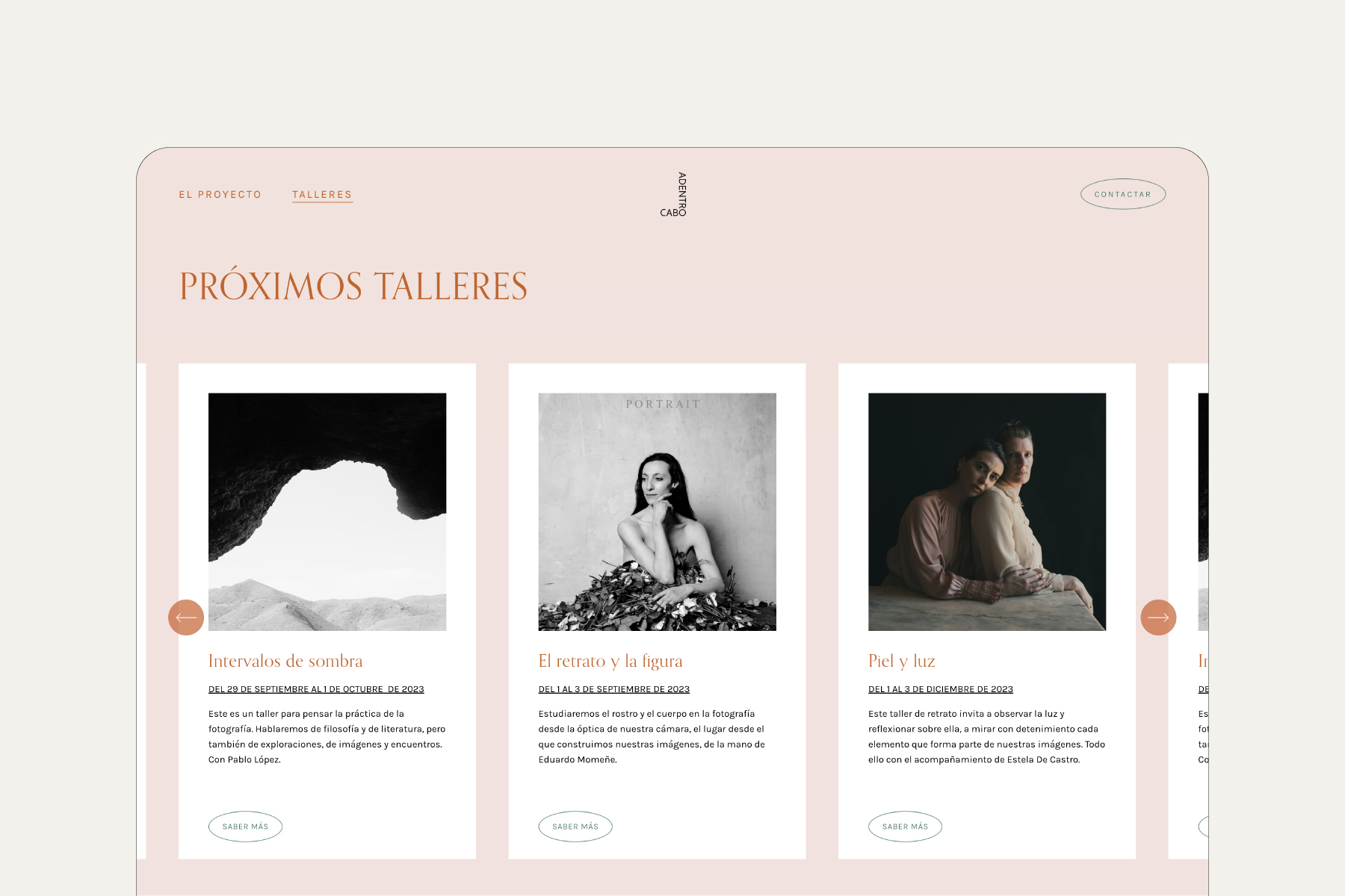 Autoras y autores tanto clásicos como emergentes ofrecen en CaboAdentro su experiencia y su visión de la fotografía. Alrededor de esto, proponemos unos días de convivencia en los que aprender unos de otros y potenciar la creatividad.»