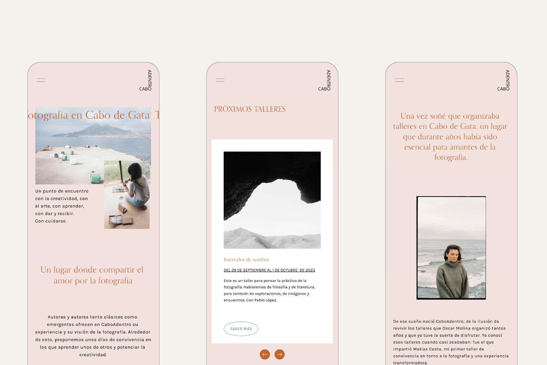 La marca que diseñé para CaboAdentro parte del concepto de Confluir, arropado por el cariño y la delicadeza de Esther, la anfitriona que hace que todo eso sea posible. La web traduce esta idea de marca donde prima la sencillez en todo momento. Una web sin artilugios, directa, amable y cercana. Donde los colores del Cabo de Gata están siempre presentes y la fotografía habita un espacio limpio y cuidado para contar historias e invita a participar de ellas.