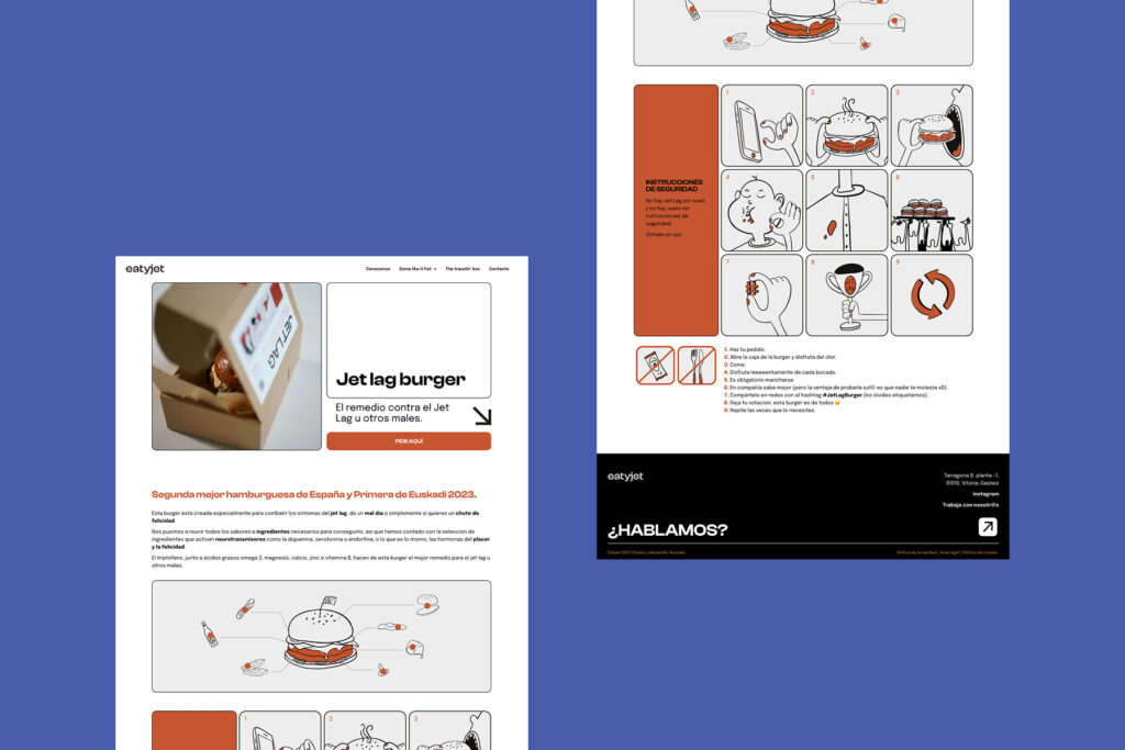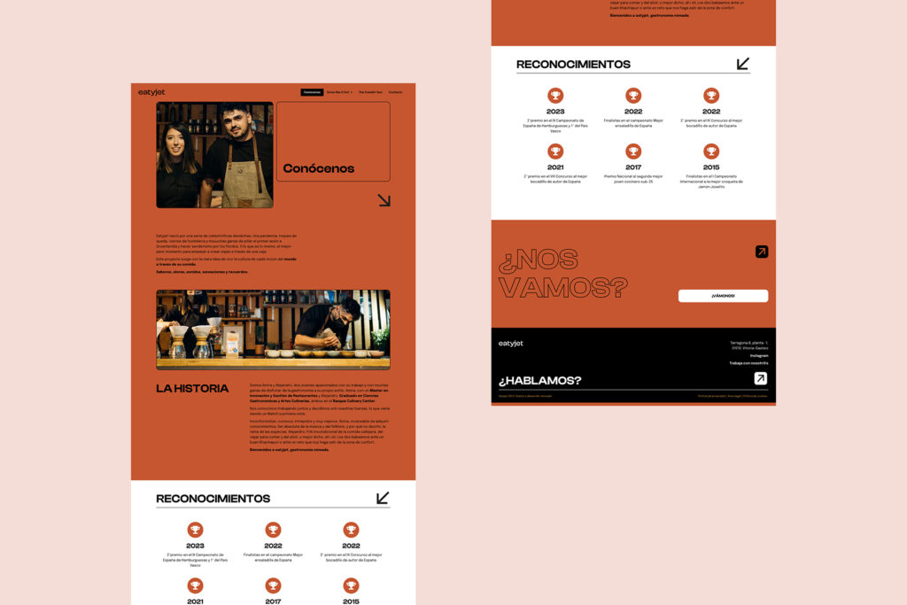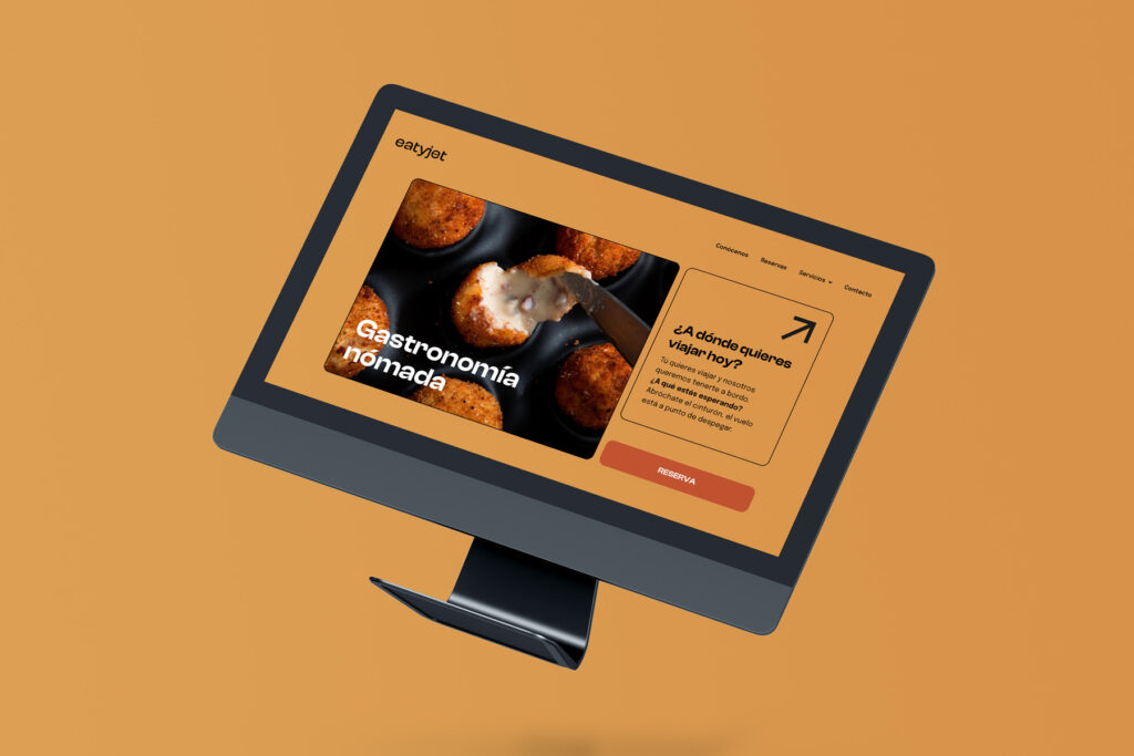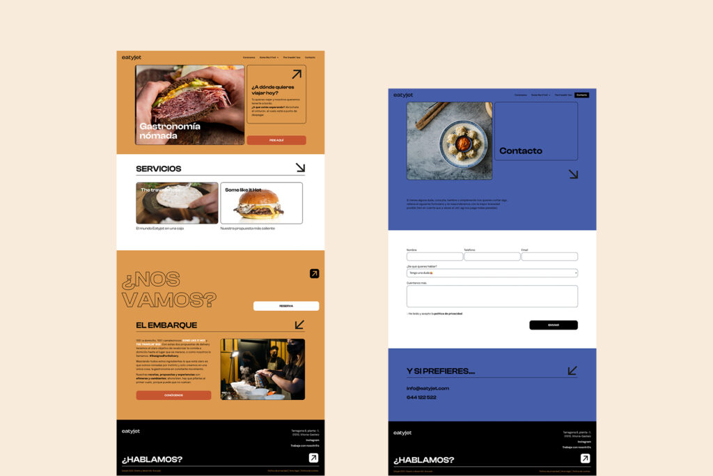 Eatyjet es un proyecto que ofrece experiencias gastronómicas de distintos destinos internacionales, tanto en formato delivery como pop up. El sistema de la marca es una simplificación de la bandeja del avión, cuyos distintos platos se convierten en formas geométricas que actúan como contenedores para los elementos de las aplicaciones. Este sistema se traslada a la web y se generan contenedores para toda la información. Además, cada página de la web tiene un único color corporativo.