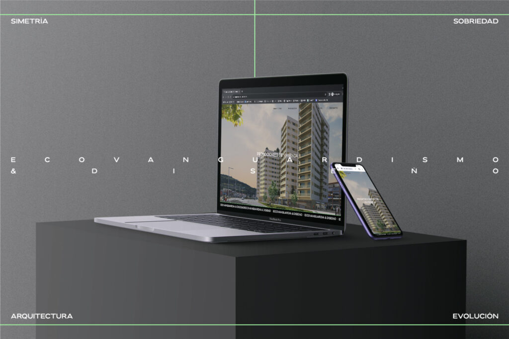 Para la web se seguirían los mismos conceptos. Se reflejan bloques y apartados escalonados como si de una construcción se tratara. Se simplifica la información y se le da presencia a los proyectos cuando el propio usuario quiere, cuando acceda a él. La uniformidad se consigue con el blanco y el negro, sumando las llamadas de atendión con el color corporativo verde neon.