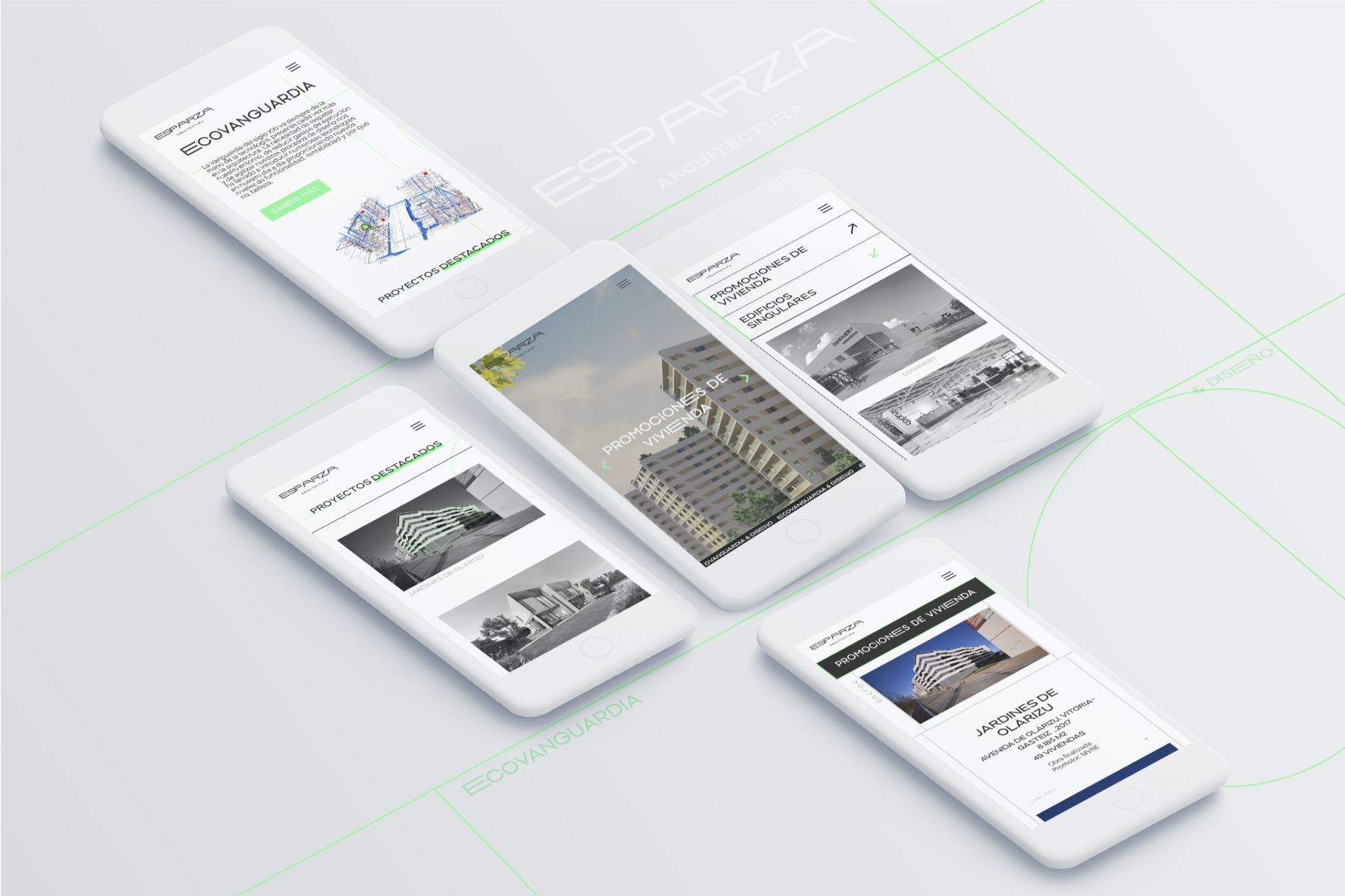 Para la web se seguirían los mismos conceptos. Se reflejan bloques y apartados escalonados como si de una construcción se tratara. Se simplifica la información y se le da presencia a los proyectos cuando el propio usuario quiere, cuando acceda a él. La uniformidad se consigue con el blanco y el negro, sumando las llamadas de atendión con el color corporativo verde neon.