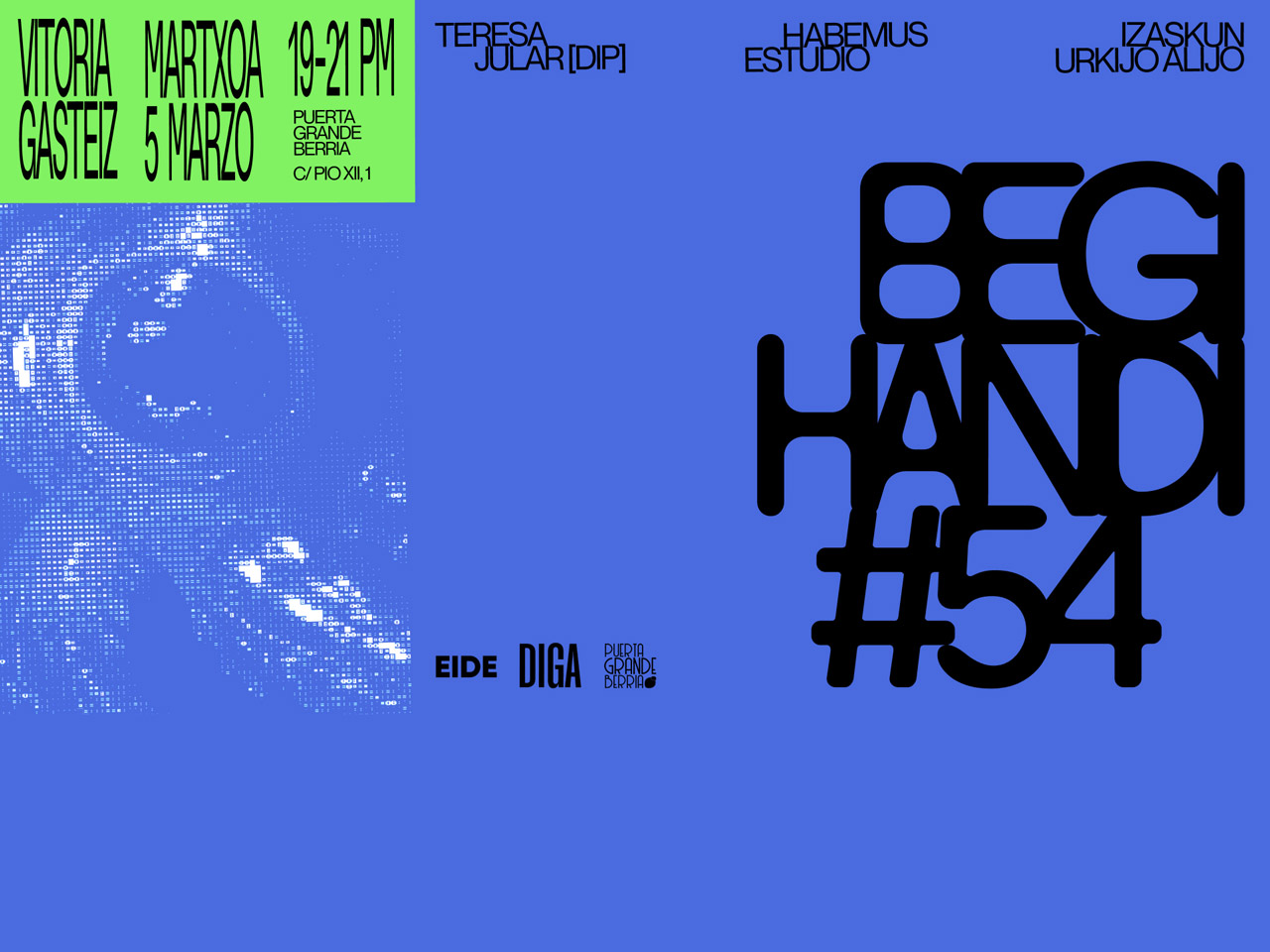 Un encuentro informal para recibir a quienes lleguen con antelación. Se presentarán brevemente tres proyectos —Habemus Estudio, Teresa Jular Pérez-Alfaro e Izaskun Urkijo Alijo— en un ambiente distendido, mientras se comparte una charla y algo de beber en Puerta Grande Berria.