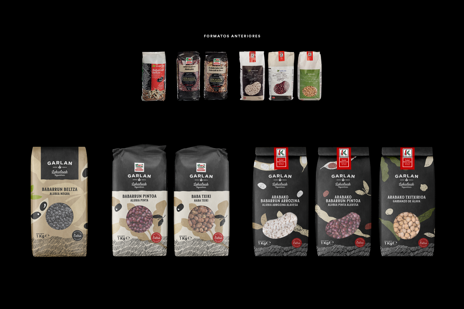 – EUSKAL BASERRI: Producto con la marca de garantía de origen. Se diferencia del anterior por la franja superior negra que le aporta mayor categoría y presencia en el lineal y favorece la rápida identificación tanto del sello Euskal Baserri como de la propia marca GARLAN legumbres.