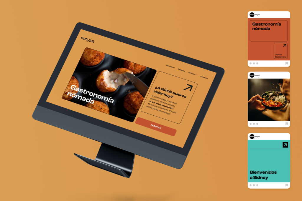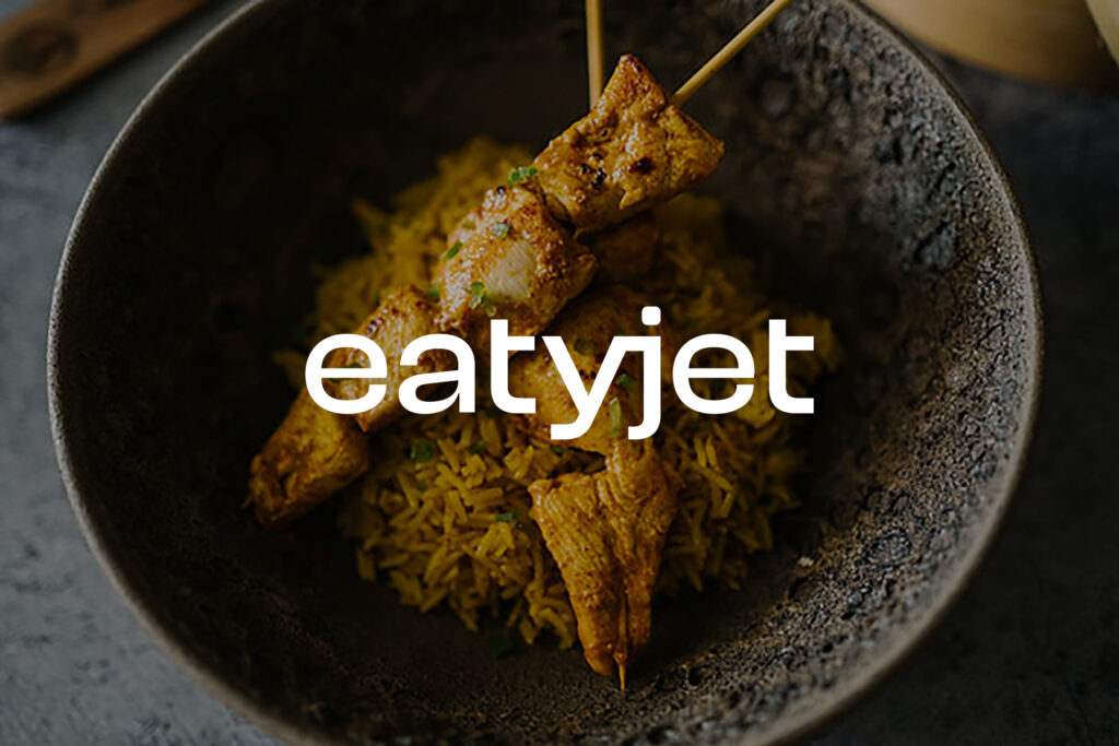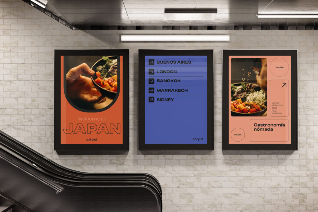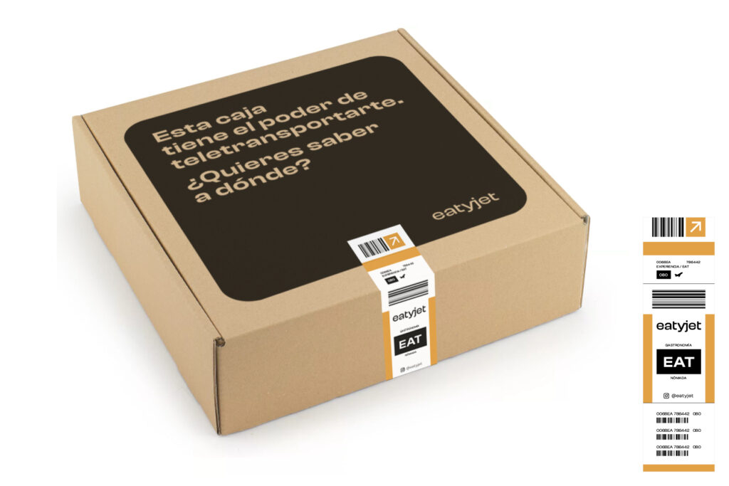 Eatyjet es un proyecto que ofrece experiencias gastronómicas de distintos destinos internacionales, tanto en formato delivery como pop up. El concepto en torno al que gira la identidad es el viaje que te transporta a esos destinos, y especialmente el viaje en avión, del que surge todo el lenguaje visual de la marca.