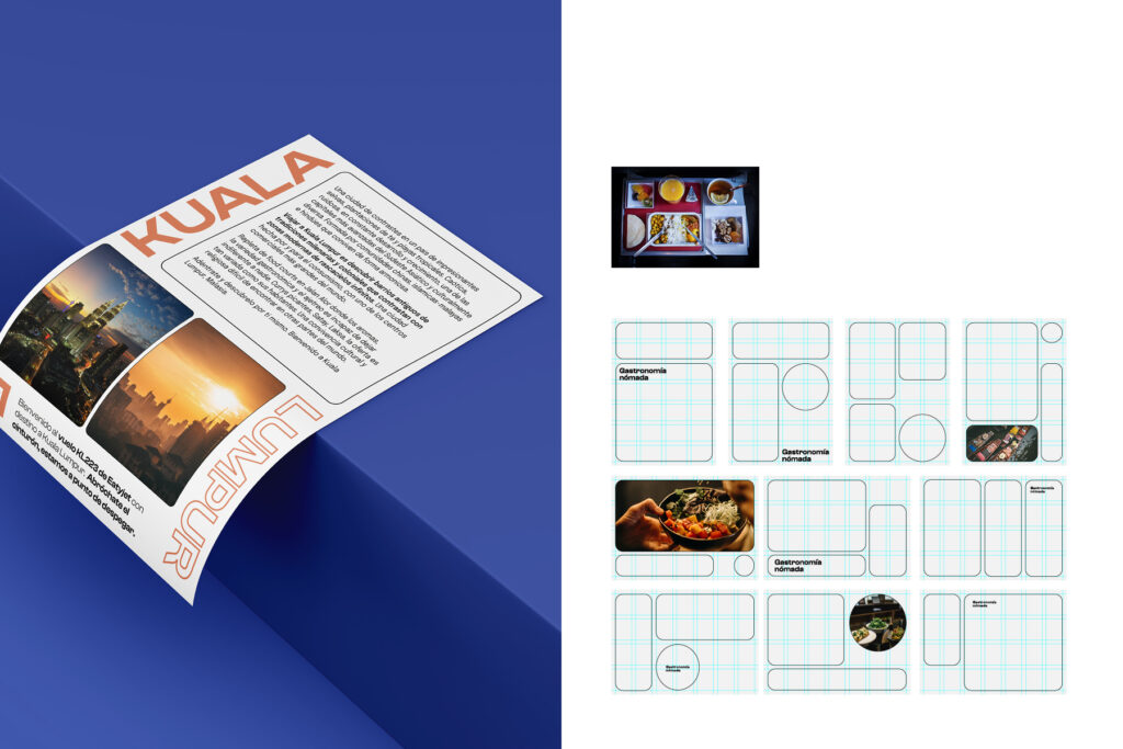 La tipografía refleja el carácter urbano y desenfadado de la marca. El sistema de la marca es una simplificación de la bandeja del avión, cuyos distintos platos se convierten en formas geométricas que actúan como contenedores para los elementos de las aplicaciones. También se usa la iconografía de la señalética del aeropuerto y la ventanilla del avión para enriquecer el lenguaje visual. La identidad busca reflejar la diversidad que ofrecen a través de los múltiples países que recorren con su comida y el carácter joven y dinámico de la empresa.