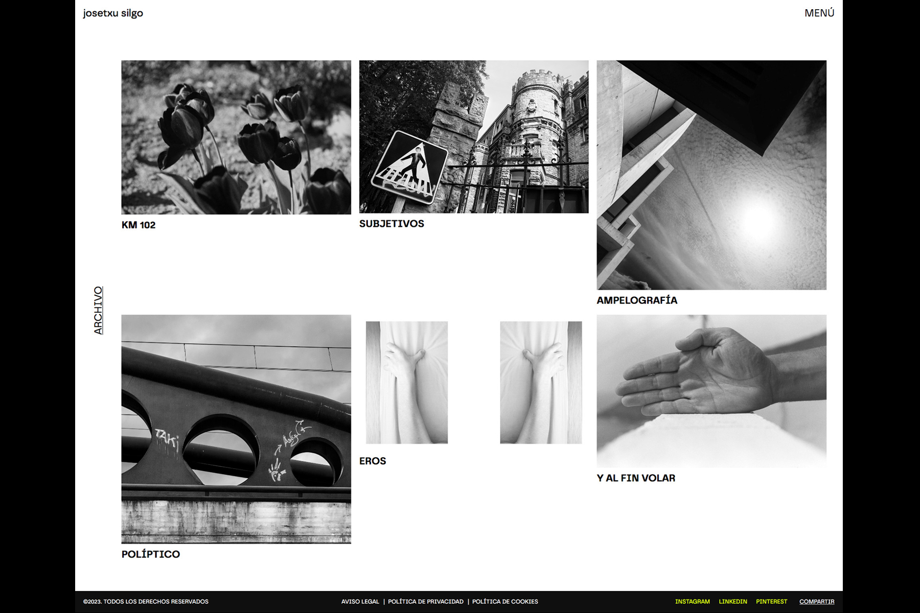 La página es un recorrido por sus diferentes proyectos, es dinámica y versátil. Incluimos un archivo donde se da el protagonismo a las fotografías en blanco y negro. La maquetación se adapta a la personalidad de cada proyecto.