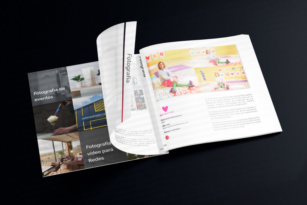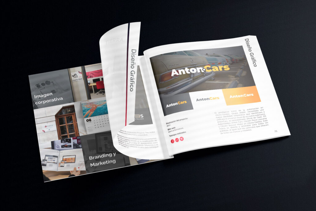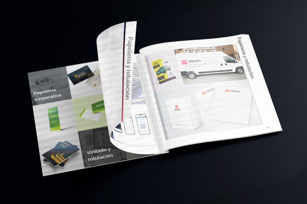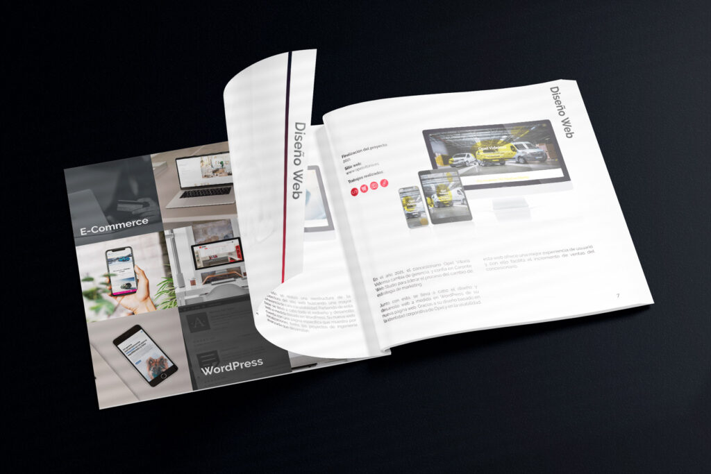 Para nuestro departamento comercial, necesitábamos un porfolio impreso a la altura de los proyectos que realizamos. Durante el año 2023 hemos realizado e imprimido un catálogo con más de 100 páginas donde mostramos nuestros mejores proyectos, divididos en categorías: Diseño Web, Diseño gráfico, E-commerce, SEO, SEM, Fotografía y Formación.