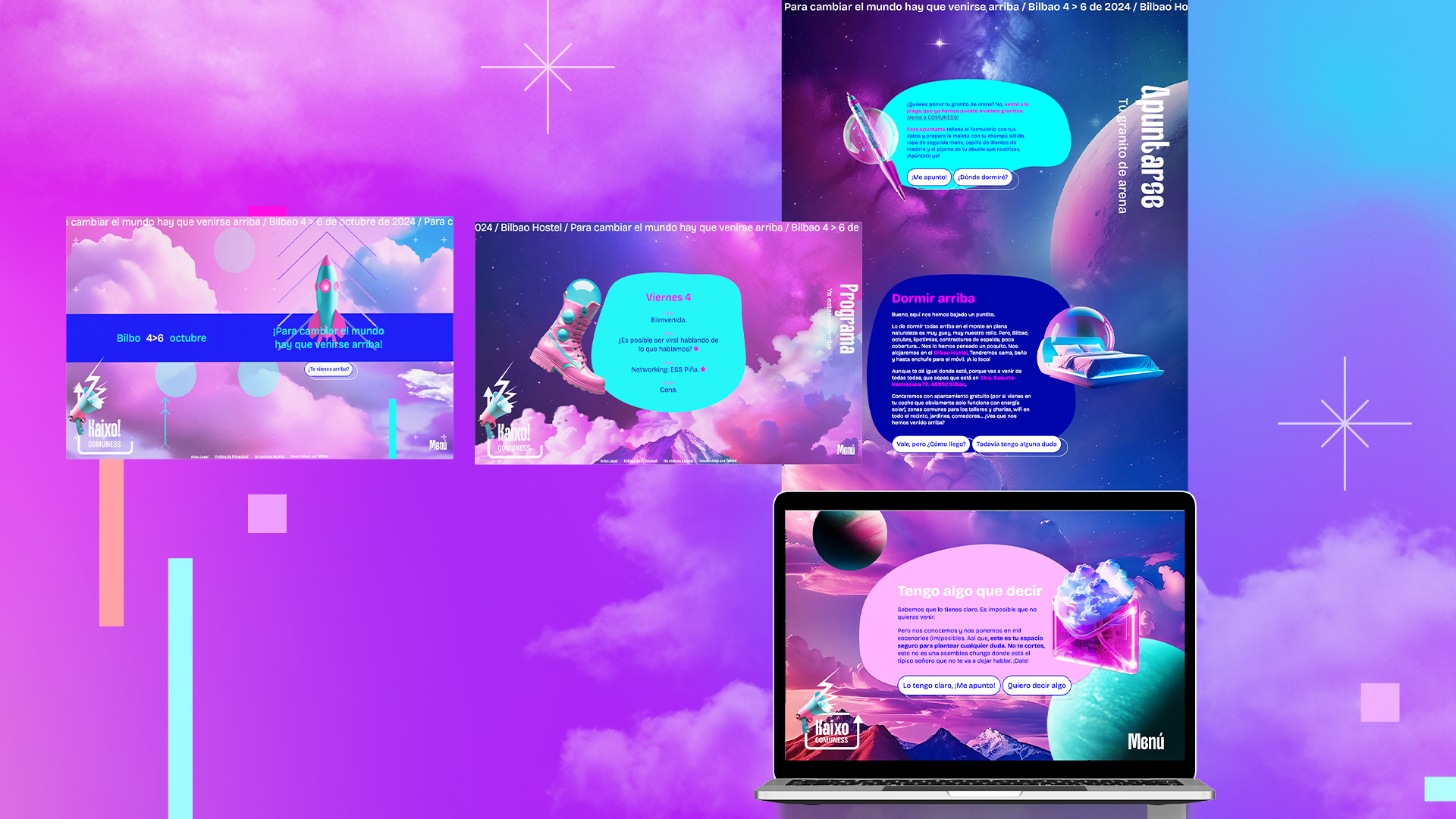 Nuestra propuesta para COMUNESS 2024 parte del lema del evento: “Para cambiar el mundo hay que venirse arriba”, que inspiró una identidad visual enérgica y contemporánea, capaz de evocar movimiento, transformación y energía. También conecta con el lugar de celebración —Bilbao— y la idea de “venirse arriba” como impulso colectivo desde distintos puntos del territorio.
