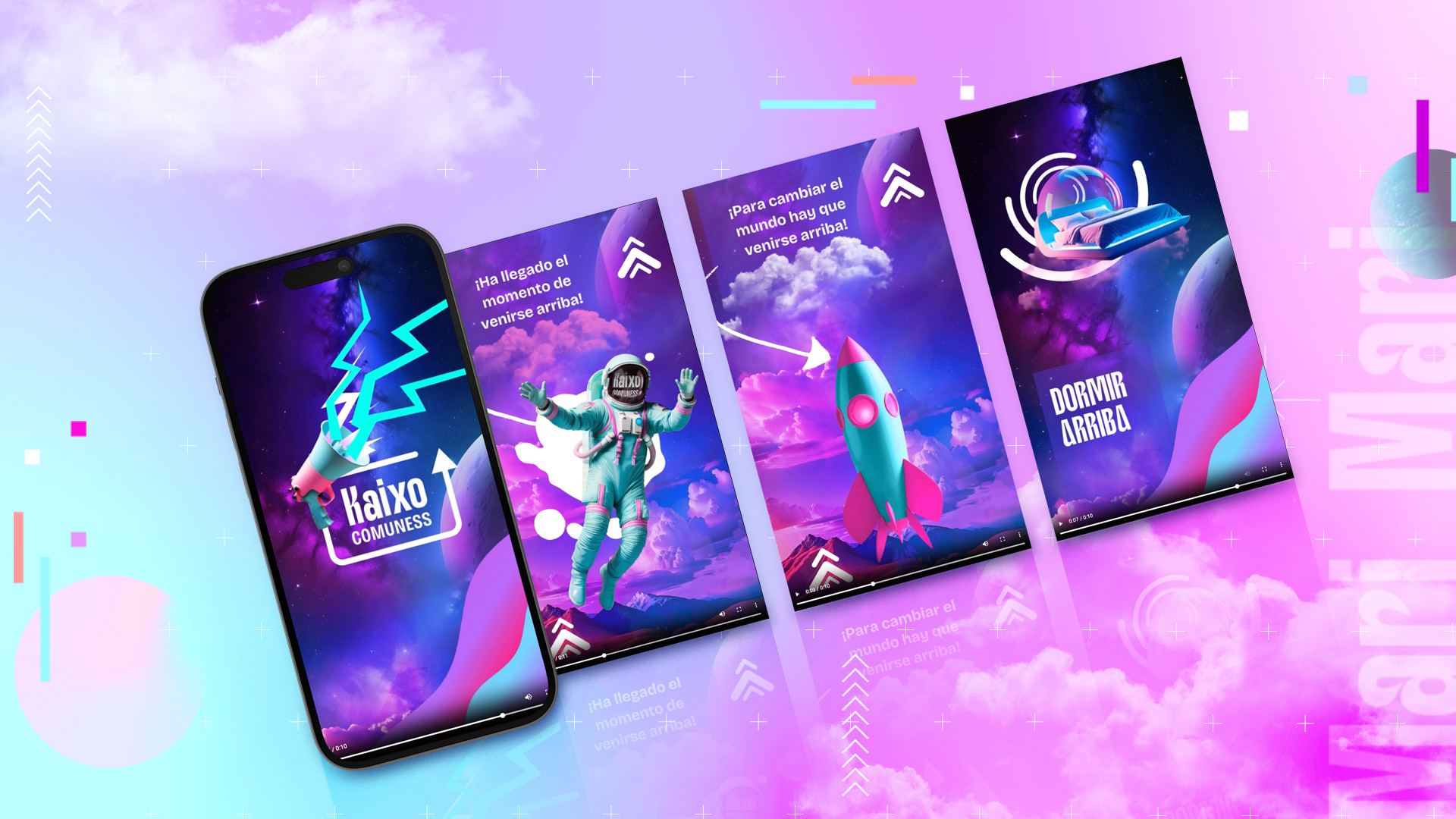 Para la campaña de rrss y banners también seguimos este mismo sistema de dividir en tres, cuando era posible vertical, etc., para poder adaptarnos fácilmente a todos los tamaños.