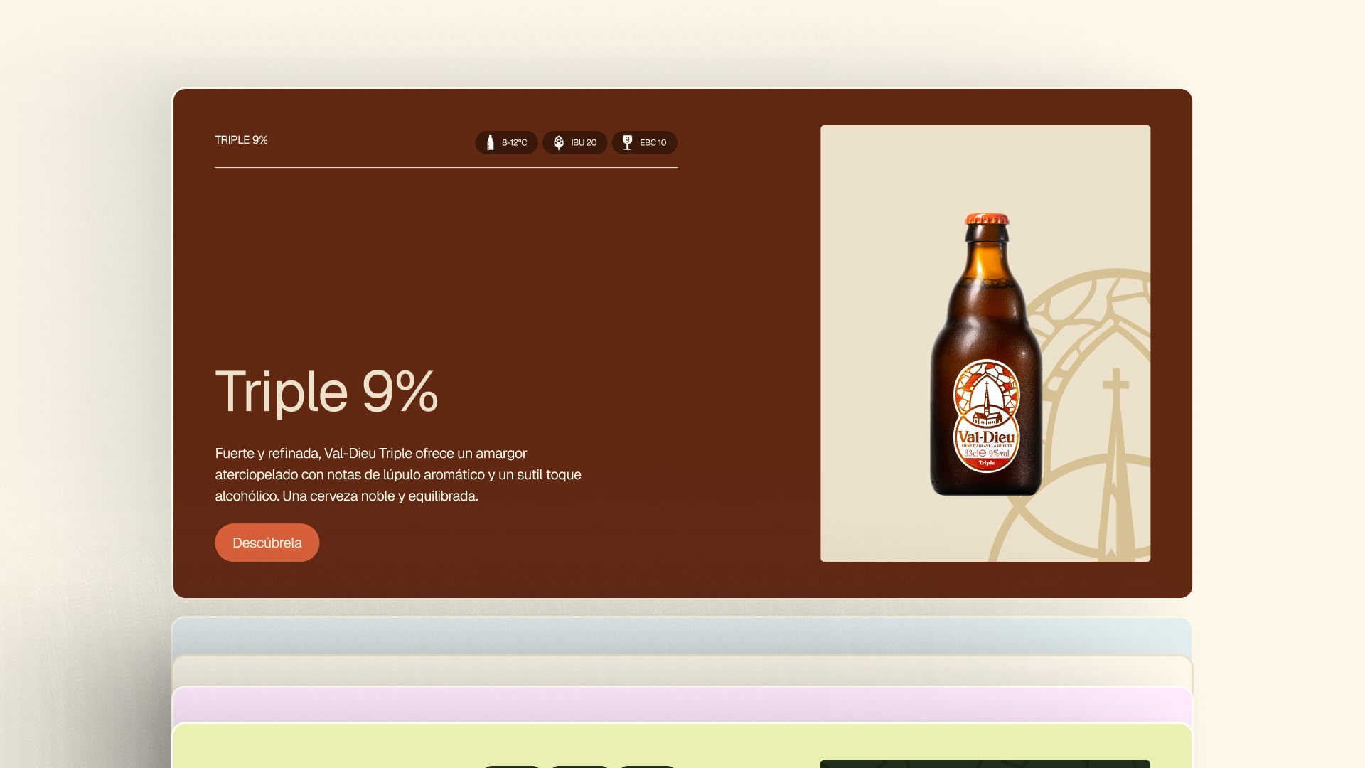 Desarrollamos una plataforma digital que no es transaccional sino emocional. Cada sección cuenta la historia de Val-Dieu de forma visual y envolvente. Las fichas de producto incluyen descripciones sensoriales, maridajes y procesos de elaboración que educan mientras emocionan. La arquitectura de información guía al usuario por un viaje temporal desde 1216 hasta hoy, haciendo tangible ocho siglos de tradición.
