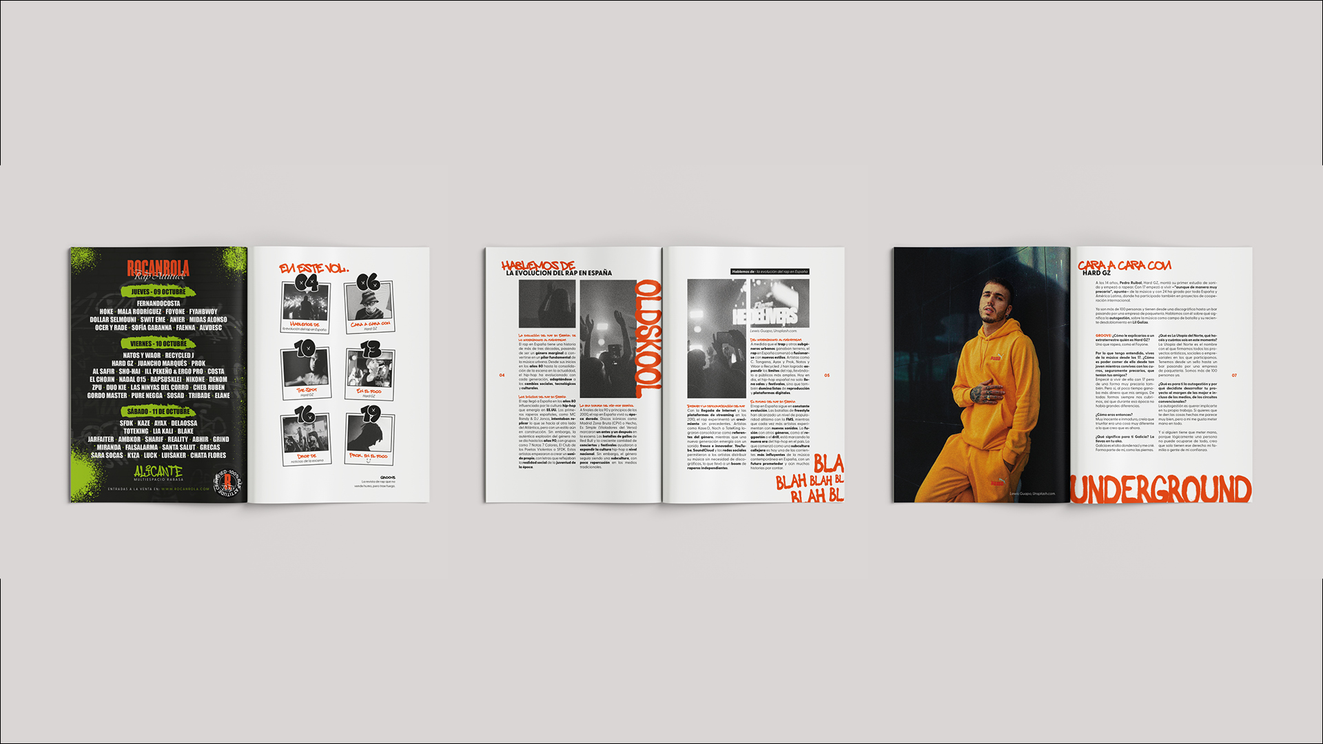 Este proyecto consistía en diseñar una revista impresa de temática musical, centrada en el rap en España. Para ello, se creó una marca editorial propia, definiendo tanto su identidad visual como el estilo gráfico de la publicación.
