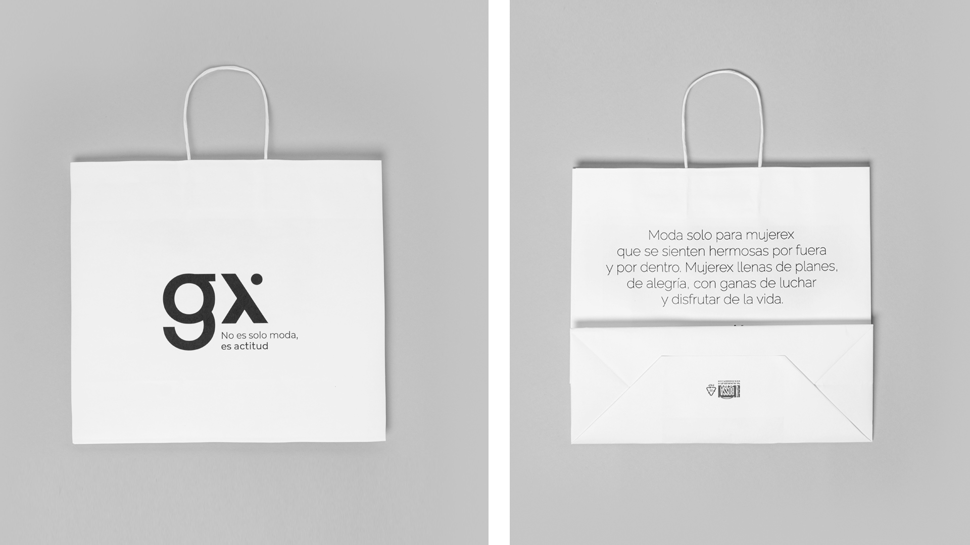 Las bolsas están disponibles en dos tamaños distintos, y quisimos acompañarlas con mensajes únicos, en línea con nuestra filosofía de que no hay dos mujerex iguales: cada una de nosotras es única y auténtica.Lo mismo sucede con las etiquetas y con un díptico diseñado especialmente, que cumple una doble función: actúa como tarjeta de presentación y también como soporte para guardar el ticket de compra. Este díptico se entrega a aquellas clientas que eligen no llevar bolsa porque traen la suya propia, permitiéndoles llevar consigo un pedacito de nuestra filosofía.