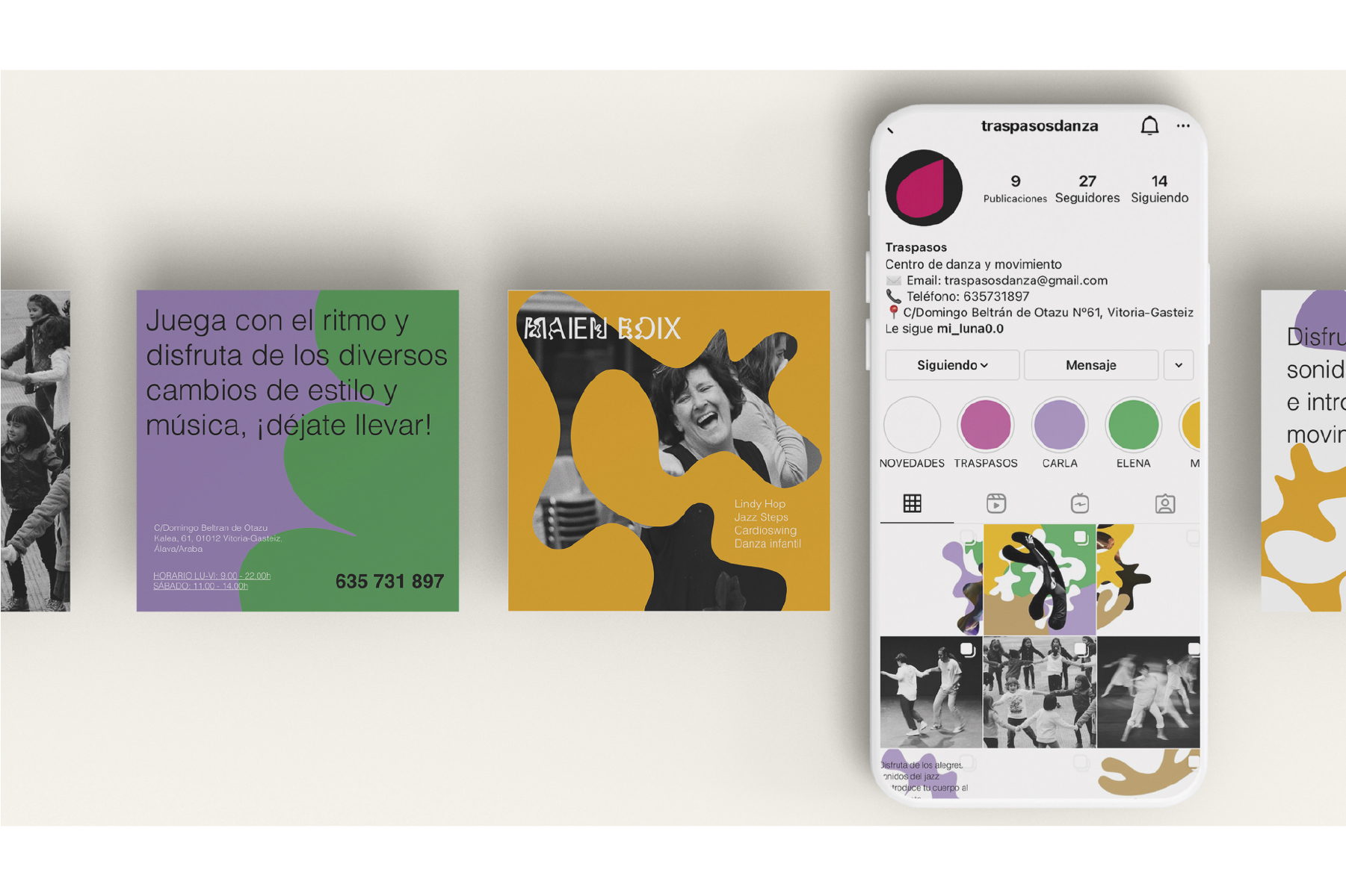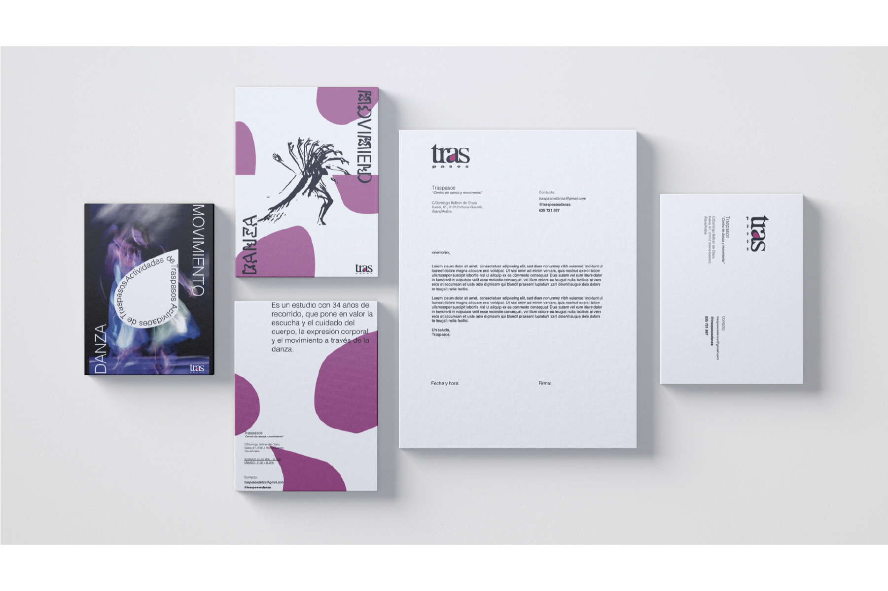 Traspasos es un estudio de danza Vitoriano con más de 30 años de antigüedad que siempre se ha caracterizado por su cercanía, humildad y familiaridad. Se realizó un rebranding únicamente del logotipo, modernizándolo pero manteniendo ese recorrido que había tenido, introduciendo así unos nuevos códigos visuales y colores que acompañarán al logo con la intención de mostrar y trascender con esos valores que ofrecía el estudio a sus alumnos.